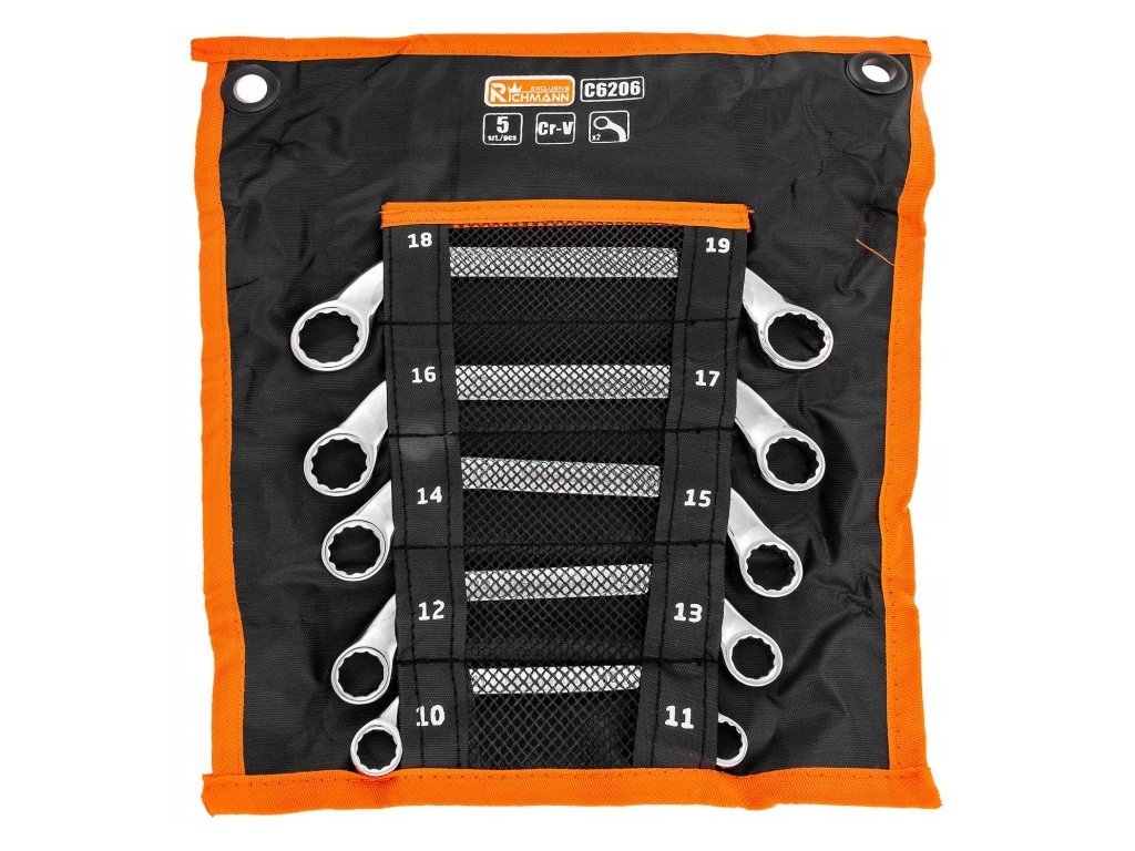 Sada 5 kusov očkových kľúčov typu "C", obojstranné, chrómované v rozmedzí veľkostí 10 - 19 mm. Zakrivený profil kľúča umožňuje odskrutkovať skrutky na ťažko dostupných miestach, napríklad pri odskrutkovaní alternátorov, zberačov, štartérov automobilov. Súprava je uložená v zrolovanom obale pre ľahké skladovanie a prepravu. Vyrobené z chróm-vanádiovej ocele (CR-V), použitý chróm zaručuje oceli odolnosť voči korózii, oxidácii, oderu a vysokú životnosť pri vysokých teplotách a prídavok vanádu má vplyv aj na odolnosť voči vysokým teplotám a nedeformovanie. Trvalé a viditeľné označenie veľkosti na každom kľúči. Obliečka je vybavená očkami na zavesenie na háčik.